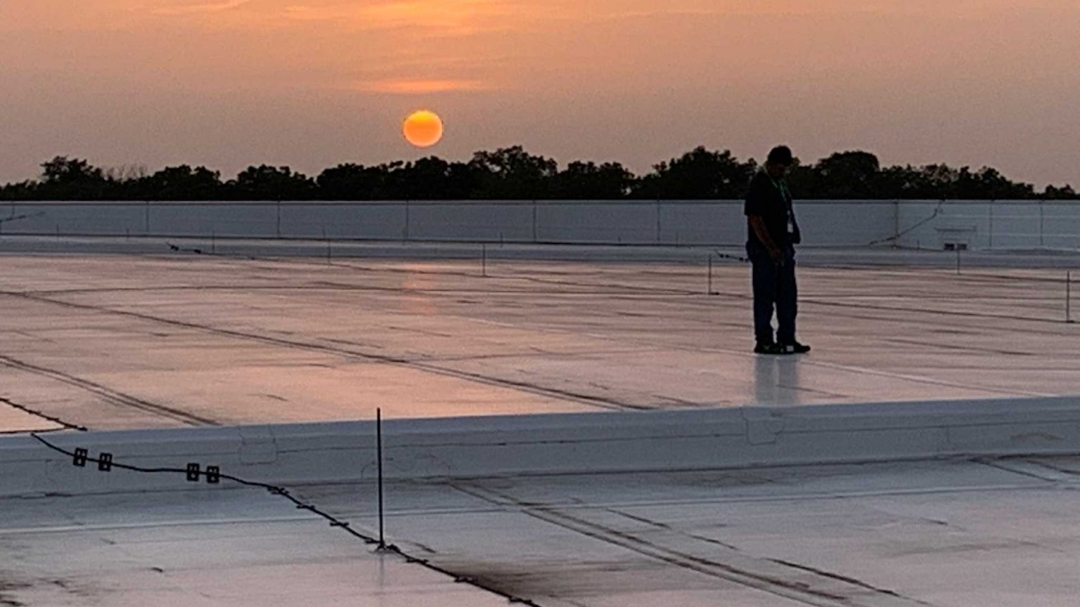 In this picture, our specialist is waiting for optimal conditions to perform an infrared scan. This roof happens to be a data center in the Kansas City area.  Coates Roofing uses infrared technology to identify defects in roofs that are commonly undetected. Owners receive reports with photos and documentation to show problem areas with recommended solutions.